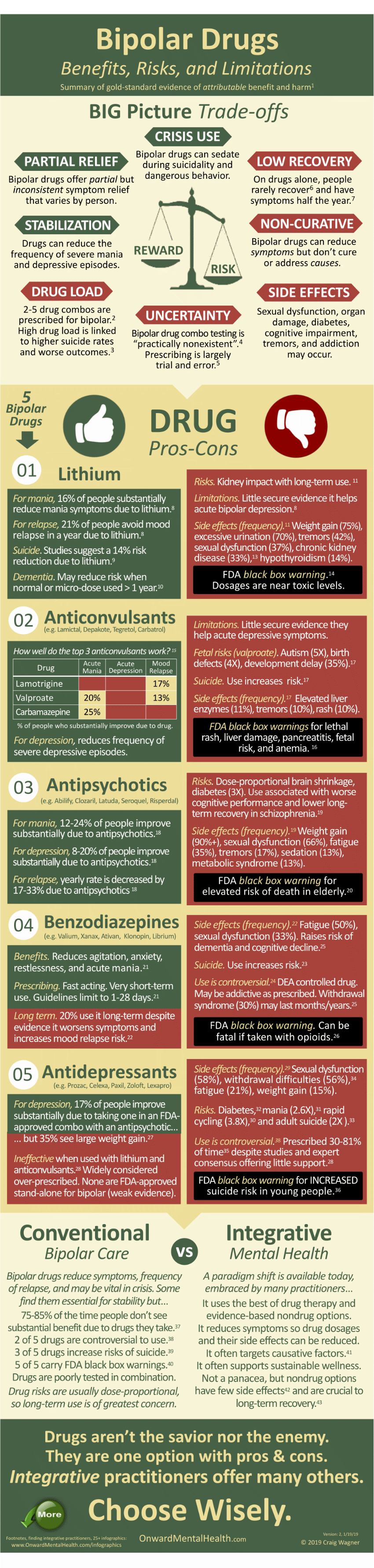 Read MoreThis post helps make sense of the mountain of bipolar drug research. It distills into an infographic the pros and cons of five classes of bipolar drugs and gives observations on what it means for people who face choices on bipolar care.