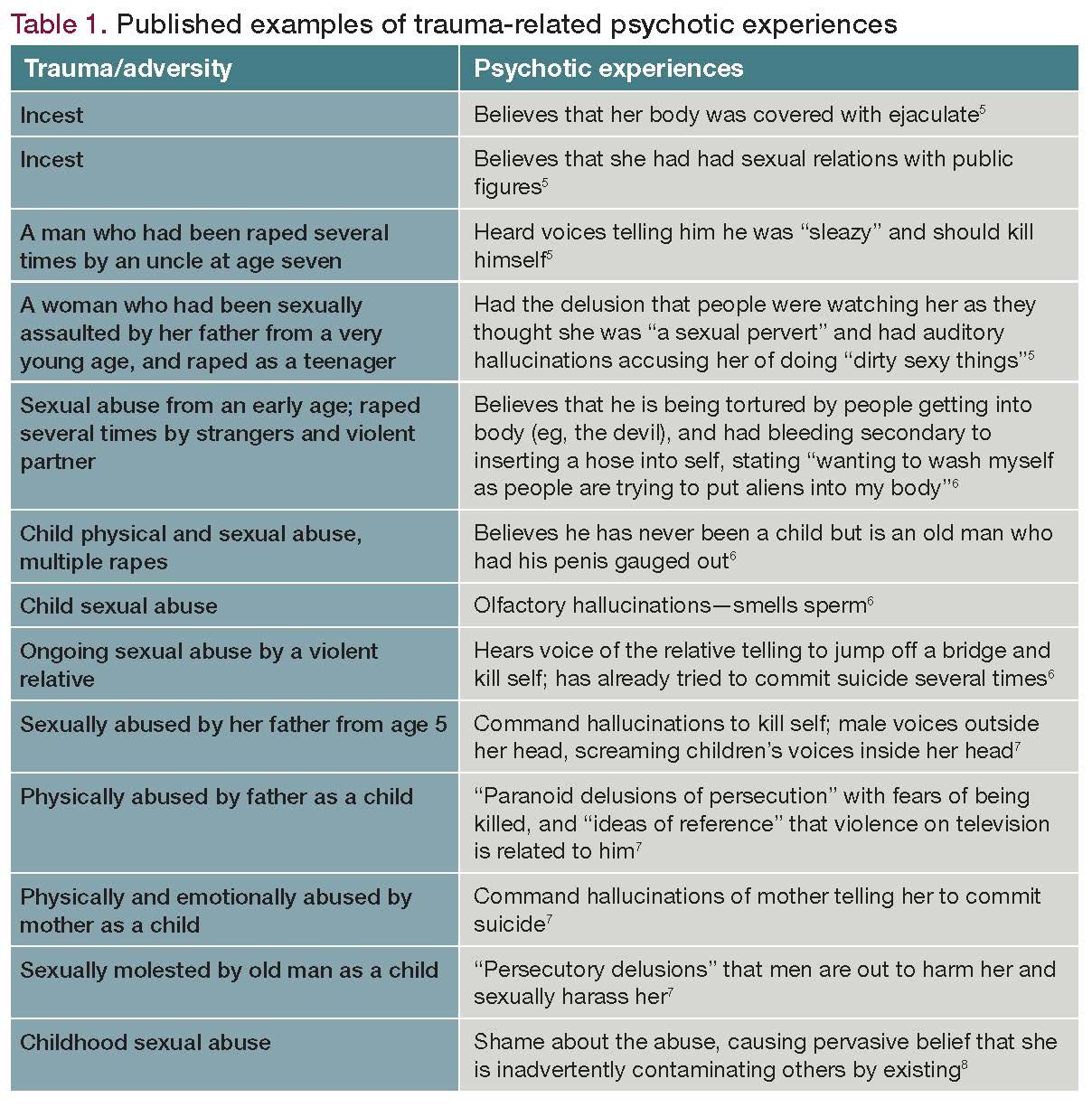 The biological, social, and psychological mediators of the relationship have been explored.3,4 The content of hallucinations and delusions is often related, directly or metaphorically, to childhood traumas (Table 1).5-8 The range of childhood adversities that have been found to play a causal role includes sexual abuse, incest, physical abuse, neglect, poverty, loss (eg, of parents), bullying, being fostered/adopted, or a combination of any of these.1-7,9,10 Relationships between specific traumas or adversities and specific psychosis symptoms have been investigated.10,11 The Traumagenic Neurodevelopmental Model of psychosis maps the similarities between the brains of traumatized children and adults diagnosed with schizophrenia.4