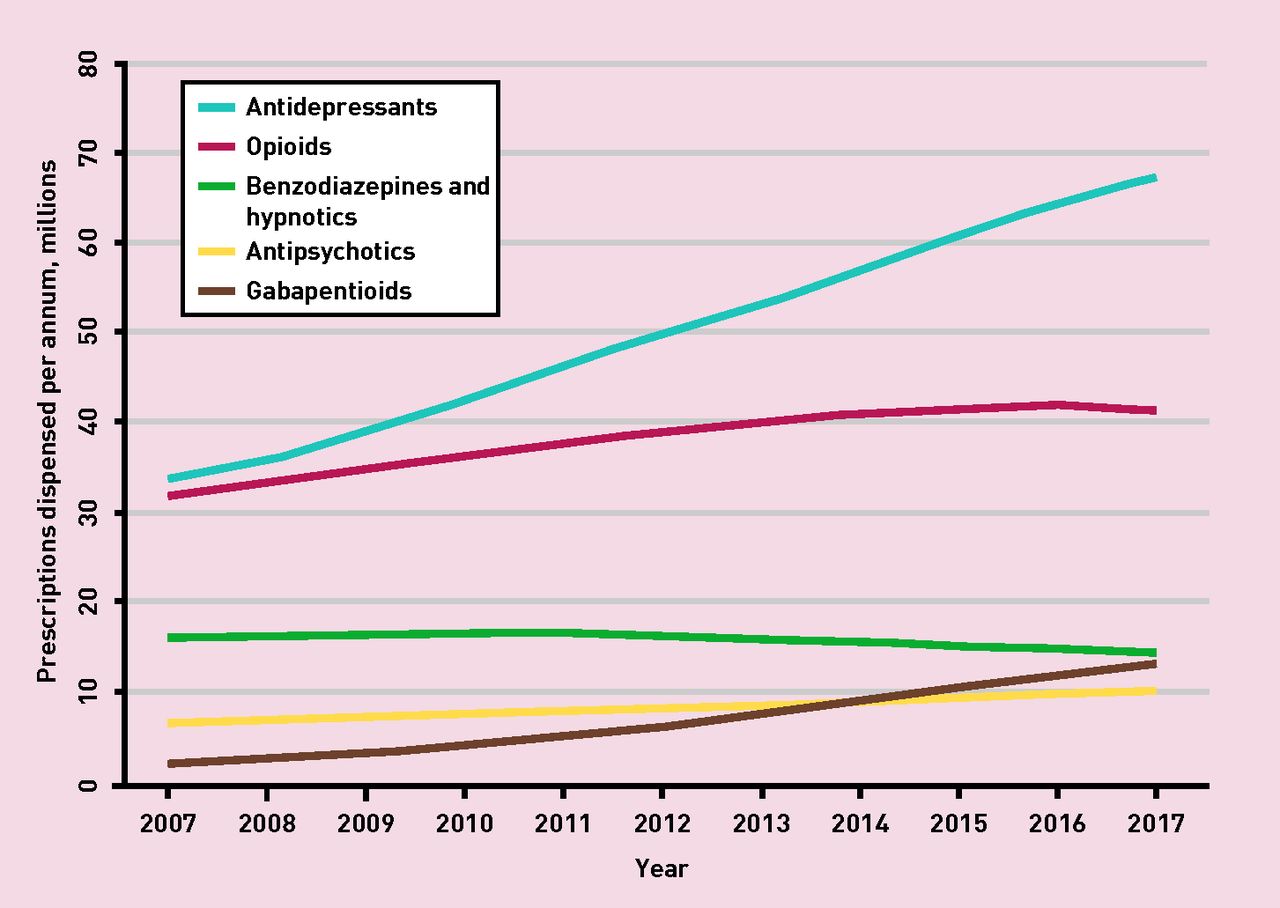The increase in gabapentinoids (pregabalin and gabapentin) prescribing in England has been dramatic between 2007 and 2017, from 2.1 to 13.2 million items per year.2 Total opioid prescriptions peaked in 2016, though more powerful agents continued to rise.2 In the last 10 years, we have seen a considerable rise in the antipsychotic quetiapine (doubling to 3.3 million items/year).2 And, the mammoth in the room, a continued decade on decade advancement in total antidepressant prescribing to 68 million items per year2 as ‘beyond guideline’ long-term prescriptions increase.1 Prescribing rates in some poor post-industrial and coastal areas boast average antidepressant scripting of 2 items per person per year.3 Figure 1 depicts the item rises together.